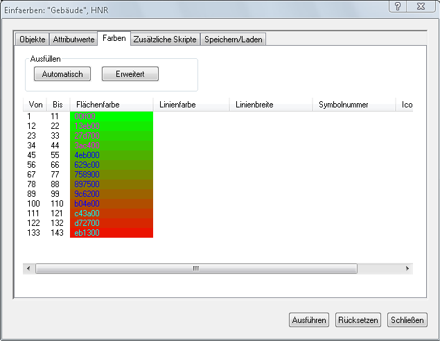 Für eine davon abweichende Konfiguration der Farben steht unter Erweitert eine zusätzliche Box zur Verfügung. Hier gibt es die Möglichkeit, Farben aus einer Farbtabelle zu laden. Die Farbtabelle muss folgende Spalten haben: ColorTableName Dient zur Unterscheidung verschiedener Farbmodelle. ColorIndex fortlaufende Nummerierung der Farben ColorValue Farbwert als RGB-Wert in zweistelligen Hexadezimalwerten. Weiß ist ffffff, schwarz 000000, rot ff0000 usw.